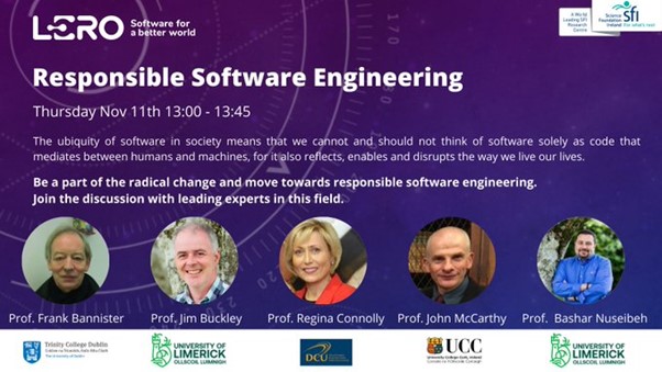 Frank Bannister, Jim Buckley, Regina Connolly, John McCarthy and Bashar Nuseibeh participated on a Responsible Software Engineering panel discussion chaired by Clare McInerney on November 11th.