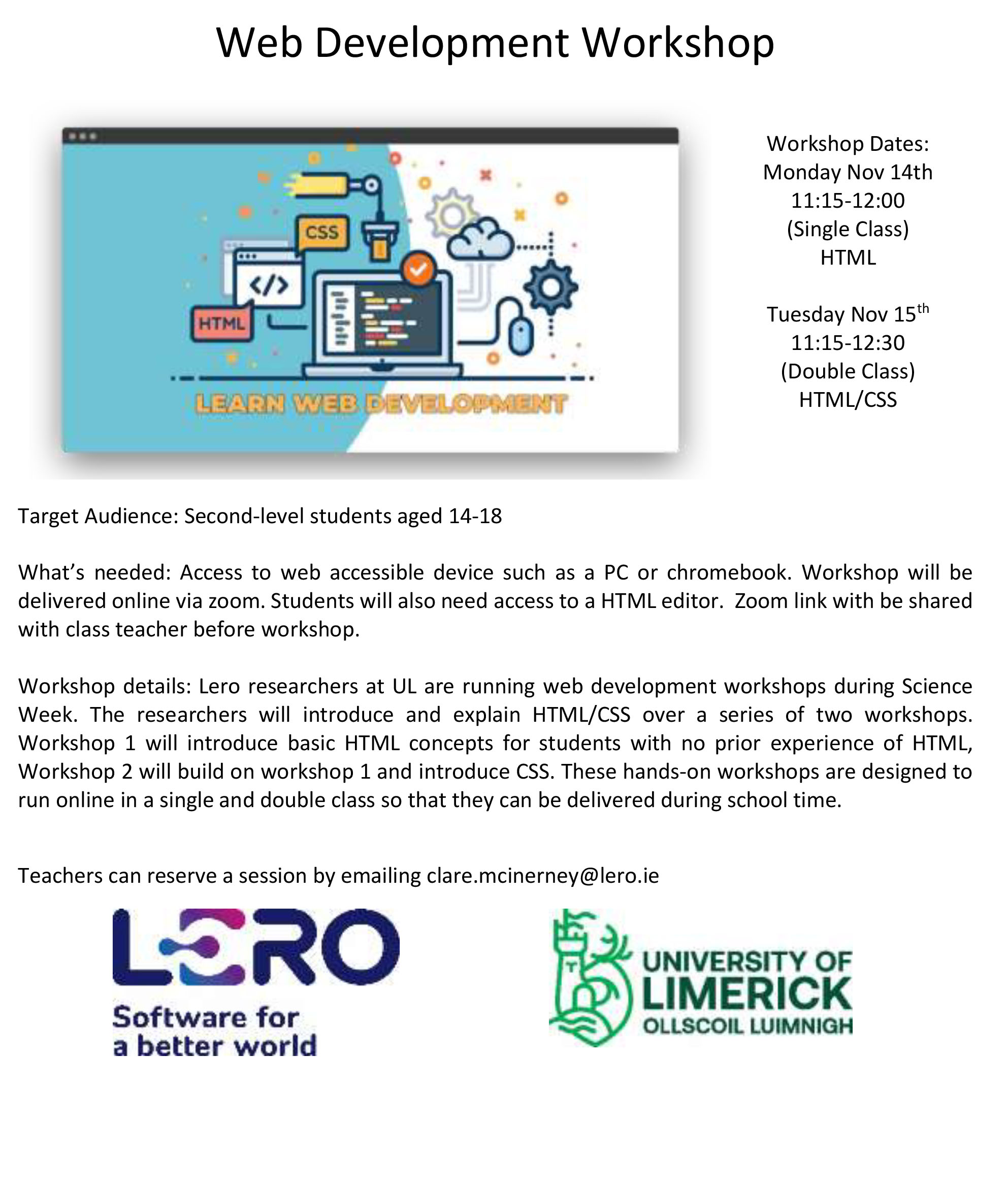 Workshop 1 – HTML takes place Monday November 14th from 11:15-12:00. Workshop 2 – HTML/CSS takes place Tuesday November 15th from 11:15-12:30. Both workshops will take place online and are suitable for second-level students aged 14-18. Teachers can reserve a session by emailing clare.mcinerney@lero.ie
