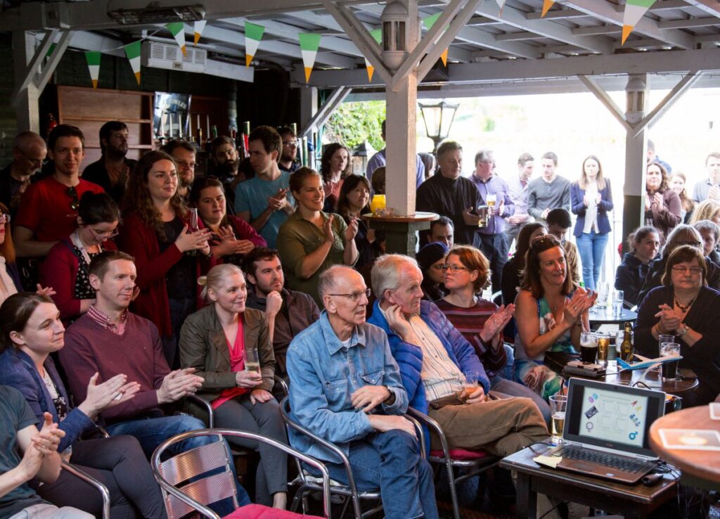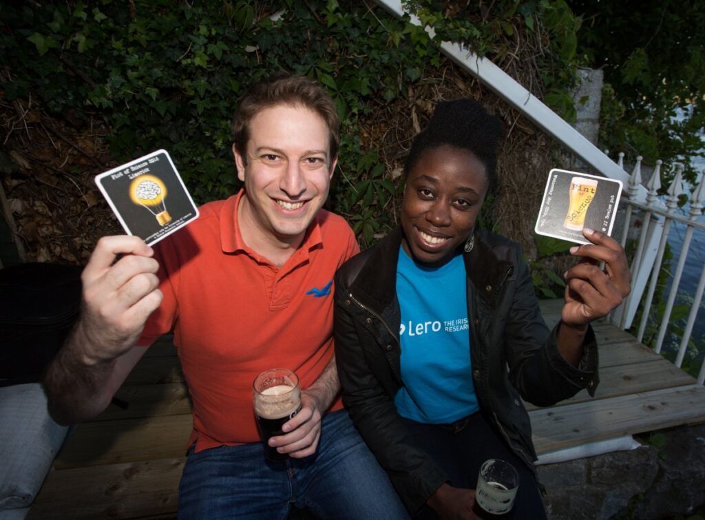 A massive crowd gathered at JJ Bowles Pub in Limerick last Wednesday, May 25th for a free scientific event called Pint of Science. This novel idea brings scientists to the local pub where they discuss their research with the general public. Presenters give the audience a better understanding of how their research findings impact every-day life. Lero researchers Dr. Fayola Peters and Dr. George Grispos presented ‘Google knows when you went to the pub’. Brendan O’ Malley MC’d the event. A great evening was had by all! Special thanks to all at JJ Bowles Pub for hosting the event.
